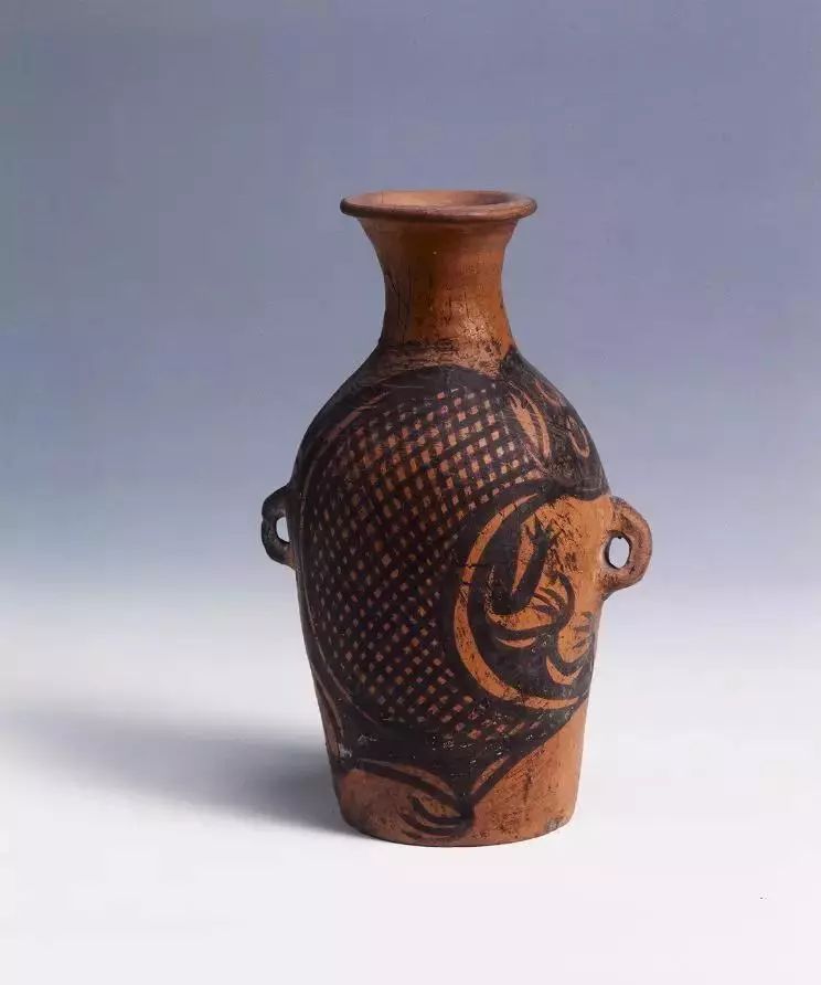 鯢魚紋彩陶瓶,仰韶文化石嶺下類型,出土于武山縣馬力鎮(zhèn)傅家門村種谷臺遺址。國家一級甲等文物,通高18.7厘米。細泥紅陶,侈口、圓唇、束頸、溜肩、深斜腹、平底,兩側(cè)肩下各有一耳。紅陶黑彩,繪有一條胖大黑色鯢魚,鯢魚紋臉部為人面,有四足,足端各有四爪,尾部上翹,身上繪有網(wǎng)格狀鱗片,紋飾線條流利而靈動,變化豐富。這件彩陶瓶具有非常高的歷史和文化價值,其圖案具有原始龍的雛形,被學界認為是中華龍的起源之一。