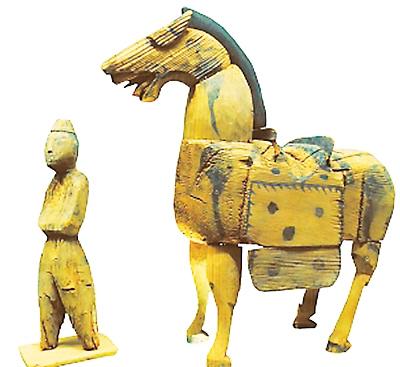 張掖市高臺(tái)縣駱駝城遺址出土的胡俑牽馬木雕。