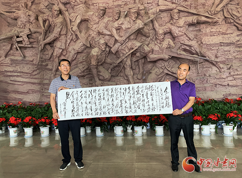 當(dāng)天,“追尋紅色足跡 弘揚(yáng)延安精神”——紀(jì)念中央紅軍長征到達(dá)甘肅85周年調(diào)研采訪團(tuán)一行,還參觀了兩當(dāng)兵變舊址及全國青少年教育基地。省延安精神研究會副會長張富奎向兩當(dāng)兵變紀(jì)念館贈送了毛體書法作品。