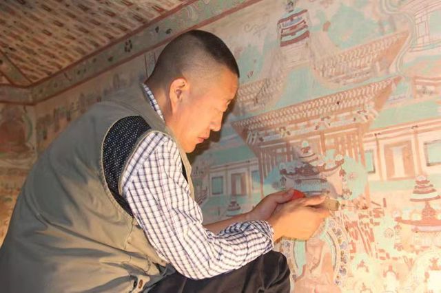 讓李曉洋最終留在這個行業(yè)的“決定性瞬間”發(fā)生在2014年,他和同事在莫高窟360窟開展壁畫修復(fù)。修復(fù)前,墻上的壁畫幾乎完全被浮塵遮蓋,損毀也很嚴(yán)重;修復(fù)后,壁畫變得清晰、線條十分明確。那一瞬間,他仿佛有穿梭千年的晃神,“這件事讓我很有成就感,覺得通過我們的努力,能夠讓更多人看到更精美的壁畫,值了。”