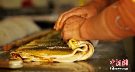 圖為將放好層層佐料的面餅拉扯,卷成筒狀。張文 攝