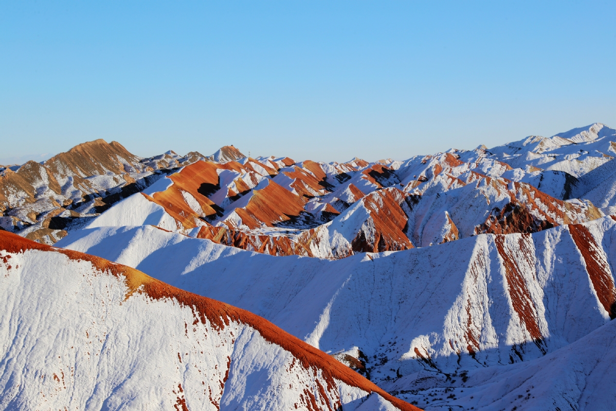 2021年12月12日,甘肅省張掖七彩丹霞在白雪的映襯下,層理交錯、色彩斑斕,顯得格外艷麗多彩、美輪美奐。