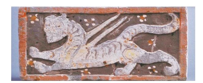 這塊彩繪磚呈長(zhǎng)方形,磚面浮雕刻出紅色邊框,邊框內(nèi)為浮雕圖案。凹進(jìn)部分墨色飾底,圖案為白色底,后以紅、黃等色彩繪,墨線勾勒。白虎是中國(guó)古代神話中的天之四靈之一,與青龍、朱雀、玄武并列“四神”,“四神”在古代原本是指方向的星辰之名,即天象的二十八宿,這是古人用作觀察日月五星運(yùn)行坐標(biāo)的28組恒星,原屬于遠(yuǎn)古星宿崇拜的產(chǎn)物。