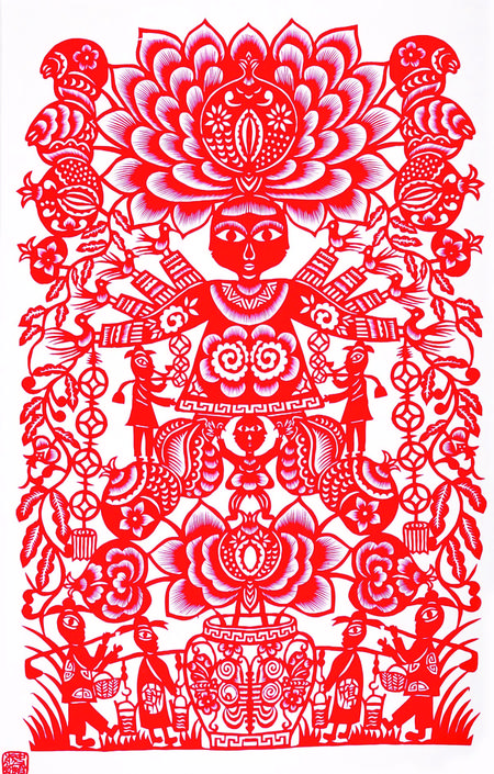 剪紙藝術(shù)題材多體現(xiàn)在祈福求安、避邪娛樂(lè)、孝道祭祀、喜事慶賀等等,例如五福娃娃、連年有余、大紅喜字、剪紙風(fēng)格也多樣化、多元化,剪紙作品一般初期主要是以對(duì)稱圖案為主,中后期主要發(fā)展成人物頭像、大型復(fù)雜圖案畫及反映和宣傳時(shí)代氣息的、人們喜聞樂(lè)見(jiàn)的多元素圖案,也將古代藝術(shù)和現(xiàn)代特征結(jié)合起來(lái)給人渲染一種藝術(shù)美、社會(huì)美、時(shí)代美的視覺(jué)欣賞、其作品妙趣橫生,秀美遒勁,雄渾大氣,喜聞樂(lè)見(jiàn),愛(ài)不釋手,廣泛流傳在城鄉(xiāng)之間。當(dāng)下,剪紙藝術(shù)作為非物質(zhì)文化遺產(chǎn),深受社會(huì)各個(gè)階層的人士喜愛(ài),把剪紙精神發(fā)揚(yáng)光大。傳承非遺,是我們共同的使命。
