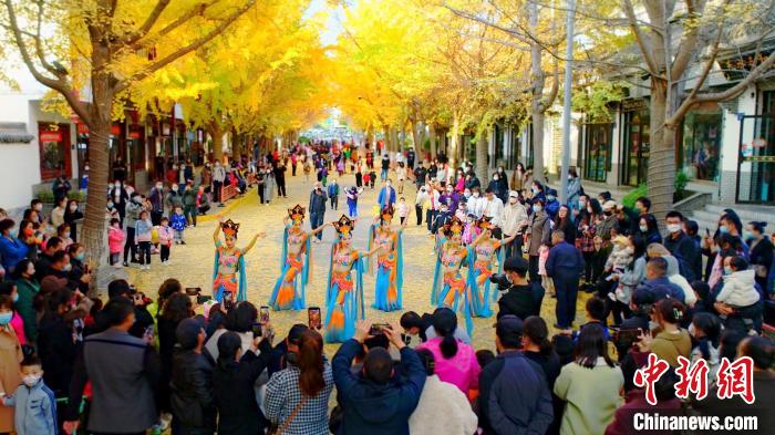 11月中下旬,在甘肅省天水市秦州區(qū)“黃金大道”上演了“絲路舞姿”,舞蹈是由秦州區(qū)文旅局組織的舞蹈隊(duì)帶來(lái)的舞蹈《絲路》《醉太平》和《萬(wàn)疆》等。該路段由于216株銀杏樹(shù)的金黃色樹(shù)葉彼此參差相連,宛如兩條“黃金色帶”在道路兩側(cè),所以被當(dāng)?shù)鼐用穹Q為“黃金大道”。