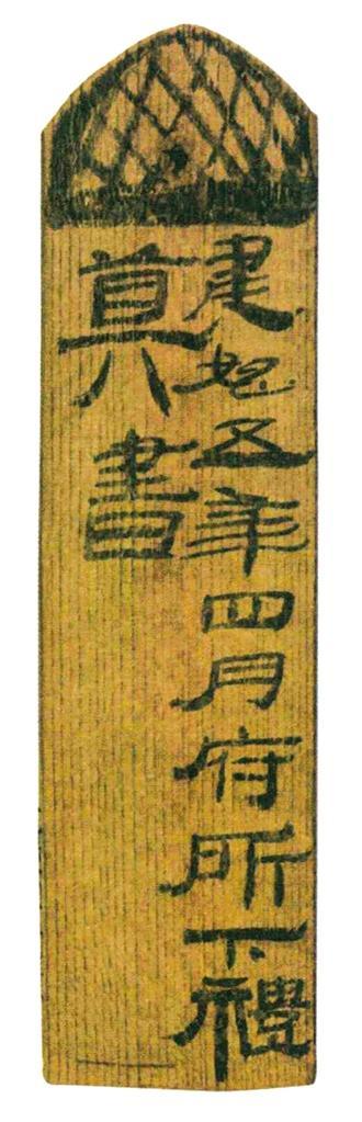 檢是傳遞文書、信札或財(cái)務(wù)時(shí)所用的封檢,分為兩種,一種是用兩行式的寬簡(jiǎn),題署收件人的姓名和傳遞方式。另一種是用于傳遞機(jī)密書信或財(cái)務(wù)時(shí)所用的加封泥蓋印章的封檢。機(jī)密書信用上下兩片木牘做成,下牘稱函,用于書信,上牘稱檢,封蓋函牘。檢上有捆繩的刻溝和置封泥的方孔,以便繩封蓋印。傳遞財(cái)務(wù)的封檢只有一片木牘,中間凹下。