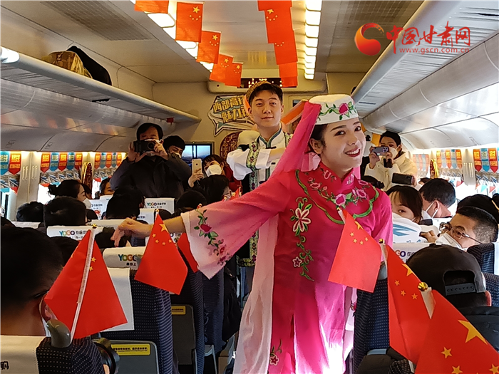 飛天與花兒相擁,甘肅與寧夏直通。蘭銀高鐵中蘭段開通,也讓銀蘭高鐵全線貫通。為了慶祝這一歷史時刻,D9058次列車乘務(wù)組準(zhǔn)備了精彩的節(jié)日。《花兒與少年》展演寧夏風(fēng)情,遇見塞上花開。敦煌樂舞,充滿甘肅元素講述飛天故事,巧妙的節(jié)目安排生動地展示了甘肅、寧夏兩省區(qū)的文化元素,讓旅途不僅有一路風(fēng)光,更有一路風(fēng)情。