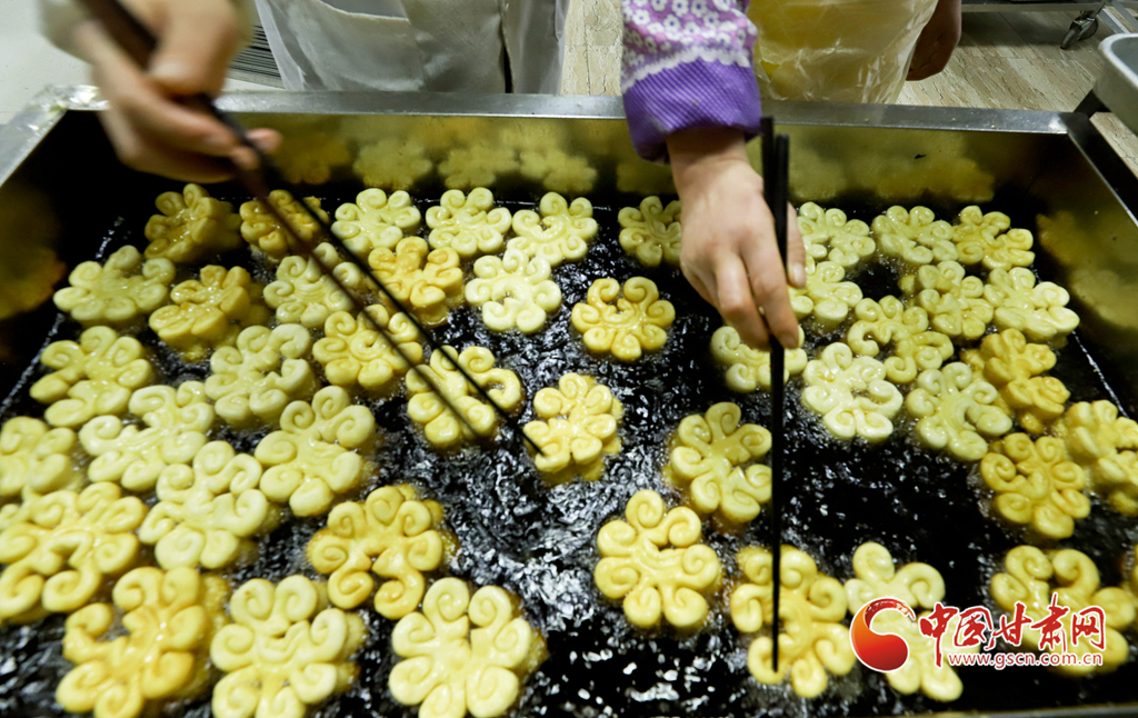 據(jù)悉,春節(jié)前炸“糖花子”是山丹縣的傳統(tǒng)習俗,至今已有百年歷史。“油炸糖花子”用醒發(fā)后的面餅切成寬約六厘米,長約九厘米的長方形,中間再切通三道裂縫,用手翻成圖案花狀,下油鍋緩煎慢炸。炸好的糖花黃中透紅,酥脆香甜,成為春節(jié)待客的頭等美食。