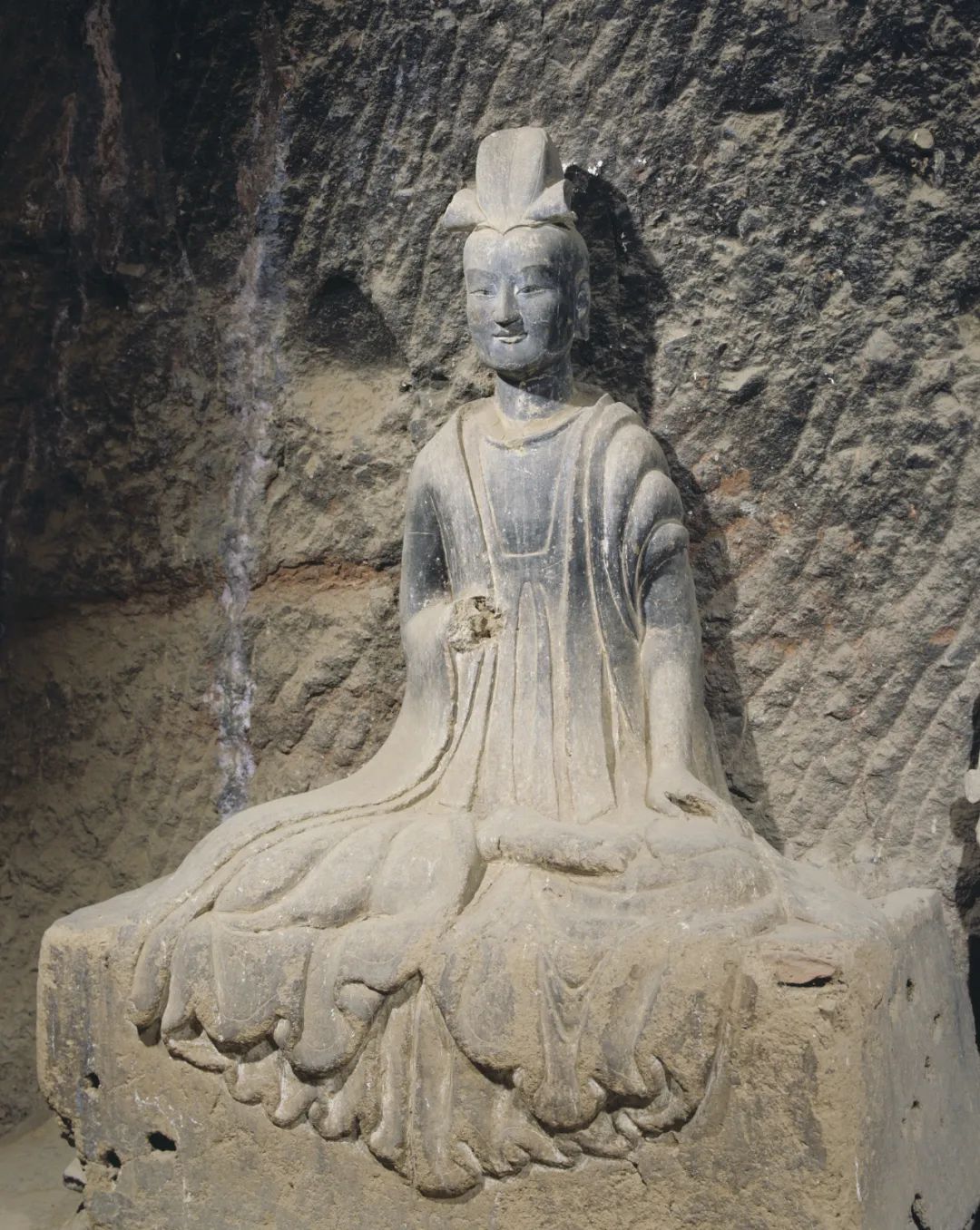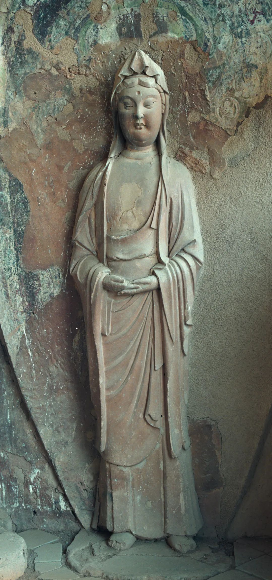 從題材上看,以單尊佛、菩薩、力士等為主,風(fēng)格上更具有寫實(shí)性。造像面相橢圓飽滿,斜眉吊目,懸鼻小口,表情森嚴(yán)、凝重,服飾簡潔、質(zhì)樸,寬博厚重,極富質(zhì)感。其中佛低平螺髻,前置肉髻珠,身穿垂領(lǐng)袈裟。菩薩束發(fā)高髻或戴風(fēng)帽,眉目慈祥,身材比例協(xié)調(diào)、準(zhǔn)確。力士表情生動傳神,體形孔武雄健,充滿陽剛之氣,給人以強(qiáng)烈的力量和威武感;這段時間造像前衰后盛也與當(dāng)時秦州所處環(huán)境有密切關(guān)系。