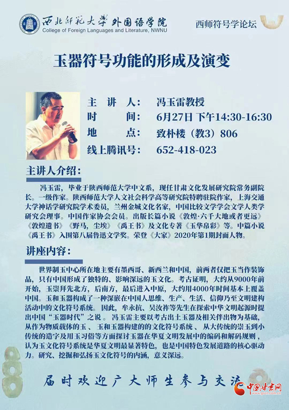中國甘肅網(wǎng)7月3日訊 6月27日下午,甘肅文化發(fā)展研究院常務(wù)副院長、一級作家馮玉雷應(yīng)邀在西北師范大學(xué)外國語學(xué)院作了題為“玉器符號功能的形成及演變”的學(xué)術(shù)講座。