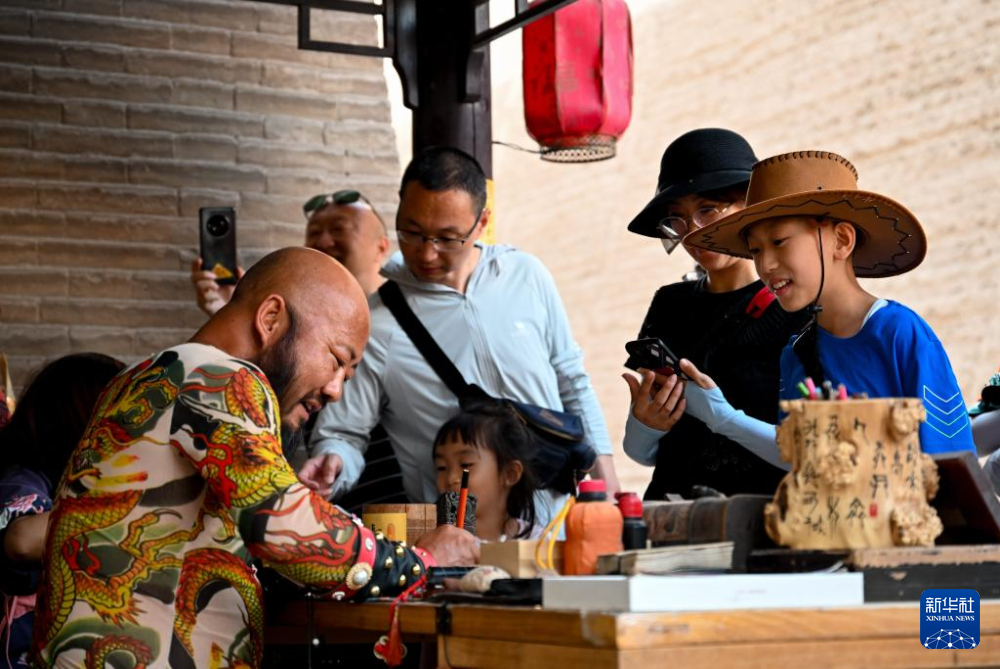 7月13日,在甘肅嘉峪關關城景區(qū),李森為游客手寫文創(chuàng)產品“關照”。新華社記者 劉金海 攝