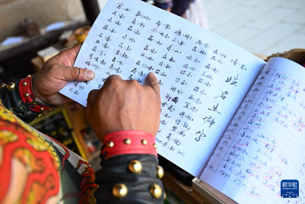 在甘肅嘉峪關關城景區(qū),李森在攤位上查閱自己編寫的含有生僻字讀音、城市古地名等內容的小冊子(7月14日攝)。新華社記者 陳鐘昊 攝