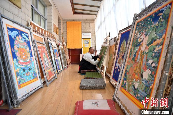圖為交巴加布在個(gè)人工作室內(nèi)給唐卡上色。一幅精美的唐卡作品,需要耗費(fèi)畫師幾個(gè)月甚至幾年時(shí)間。從勾線到著色,每一步、每一筆都要屏息凝神。九美旦增 攝