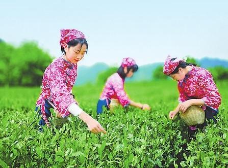 走進(jìn)茶園里,看到數(shù)名茶農(nóng)身挎小竹籮,慢慢穿行在茶樹之間,只見她們動(dòng)作快速而嫻熟,一捻一放,徐徐前行在滿眼的綠意里。