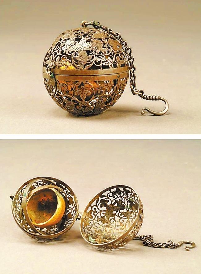香囊最出彩的地方是機環(huán)常平架技術(shù),是一種利用球體內(nèi)兩個同心機環(huán)與中央焚香盂之間的重力作用,使其在自由轉(zhuǎn)動的時候,始終能保持平衡的機械原理。唐代的香囊豐富多樣,這種金屬造型的香囊設(shè)計更為機巧精致,深受妃后、貴婦們所推崇喜愛,它上承漢代的常平架技術(shù),下延現(xiàn)代陀螺儀萬向支架技術(shù),是中國古代科學(xué)技術(shù)與手工藝技術(shù)對世界的杰出貢獻(xiàn)。