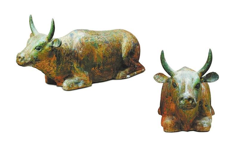 鎏金銅牛是寧夏博物館的鎮(zhèn)館之寶,出土于西夏陵101號陪葬墓。銅牛長120厘米,寬38厘米,高44厘米,重188公斤。整座銅牛造型獨特,取跪臥姿勢,雙角彎曲,雙耳橢圓直立,鼻子微微向上翹,眼睛圓睜注視著遠(yuǎn)方。它頸部的肌肉線條非常清晰、流暢。銅牛雙眼炯炯有光,卻又呈現(xiàn)溫馴之態(tài),神情極似魯迅先生筆下的“孺子牛”。該國寶級文物集塑形、鑄造、鎏金、拋光等許多工藝于一身,真正達(dá)到了以形傳神、神形兼?zhèn)涞乃囆g(shù)境界。