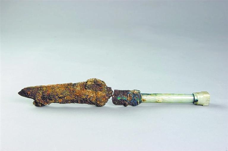 玉柄鐵劍出土于河南三門峽虢國國君虢季的墓葬,全長34.2厘米,其中劍柄長12.2厘米,劍身長22厘米。劍柄為銅芯,起到連接劍柄和劍身的作用,銅芯外鑲有晶瑩透亮的和田美玉和綠松石,并有精美的竹節(jié)飾紋,劍身和劍柄的結(jié)合處也鑲有綠松石。劍身經(jīng)由北京科技大學(xué)冶金與材料史研究所鑒定,是由塊煉法鍛制而成,劍身外有絲織品包裹的痕跡,應(yīng)當(dāng)是被絲織品包裹后放入劍鞘。劍鞘則由牛皮精制而成。這把玉柄鐵劍不僅制作精美,而且其利用玉、銅、鐵三種材料制作而成,是我國目前考古發(fā)掘出土的年代最早的人工冶鐵制品。它將我國的人工冶鐵歷史推前了近兩個世紀(jì),被專家們譽為“中華第一劍”。