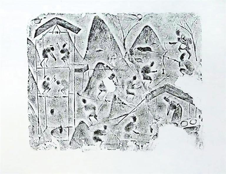 巴蜀地區(qū)是中國乃至世界鹽業(yè)最早的起源地之一,史載戰(zhàn)國時期巴蜀就已開鑿鹽井、汲鹵煮鹽。秦在此設(shè)鹽官,至漢代,四川地區(qū)的井鹽制作已經(jīng)具有一定的規(guī)模,分工細(xì)致,工具完備。此畫像磚表現(xiàn)了漢代制鹽的情景:畫面左下角有高聳的井架,架上安置有轆轤,用以轉(zhuǎn)動系在繩索上的吊桶,交替吸鹵,高架旁有一鹵槽,將鹵引入煮鹽的釜內(nèi),釜下架設(shè)有灶,有人正奮力用扇燒起熊熊烈火。