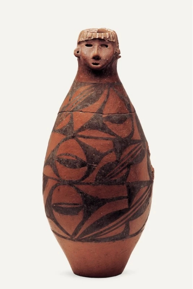 隴東少女作為甘肅的“顯眼包”之一,是曾在《國家寶藏》中出現(xiàn)過的“網(wǎng)紅”、甘肅省博物館鎮(zhèn)館之寶,它于1973年從秦安縣大地灣遺址出土。具有高度審美能力的“托尼”老師,設(shè)計(jì)了齊劉海發(fā)型,顯得很泰酷辣,圓鼓腹、平底,人們細(xì)看發(fā)現(xiàn),陶人的兩眼為圓孔洞,顯得目光深邃;鼻子呈蒜頭形,雕有鼻孔;嘴較小,微微張開,好像正在言語;兩耳外展,皆有穿孔;瓶體從上至下以黑彩飾三層大小相同、由弧線三角紋和斜線組成的二方連續(xù)圖案,以示華麗的衣物。另外,陶瓶人頭像的器口運(yùn)用了不同的制作手法,頭發(fā)、嘴系雕刻而成,鼻、臉是捏塑而成。人頭像五官整齊、面龐秀麗,器身造型典雅,與人物形象渾然一體,既是大地灣文化彩陶的代表作,也是中國史前集彩繪、雕塑與造型藝術(shù)于一身的杰作。估計(jì)任誰看一眼,都會被“她”的神秘和美麗所吸引吧。