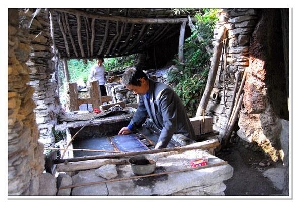 走到山麓,我們看到晶亮的小溪像一條小蛇蜿蜒而來,一個(gè)用石頭砌起的水潭上,用幾根木頭支起漁網(wǎng)一樣的物件,水潭上有一間同樣用石頭砌成的操作間,屋頂用石板苫蓋,四周張著篷布遮蔽陽光,這就是傳說中的紙坊嗎?