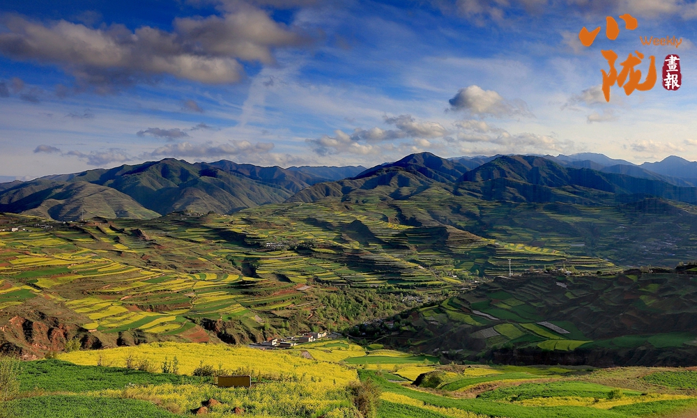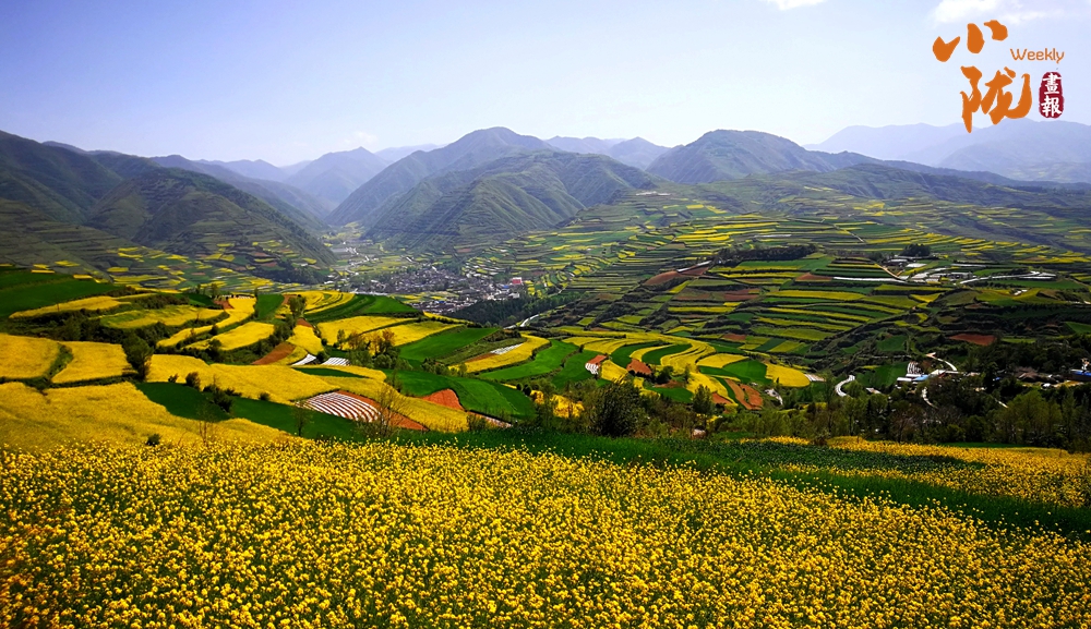 遠處黃綠交錯的油菜花,在藍天白云襯托下艷麗多彩,起伏的山巒上黃色顯得尤為斑斕,這里是眾多畫家、藝術(shù)家的創(chuàng)作天堂。