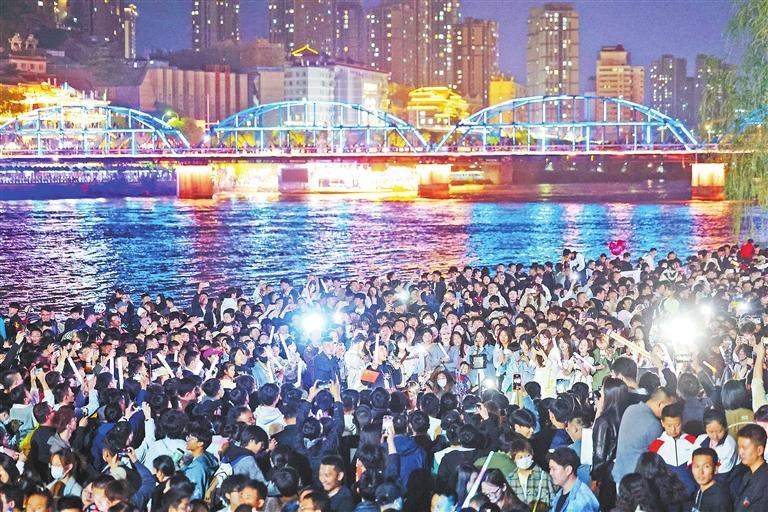 作為蘭州的地標(biāo)之一,中山橋已經(jīng)是來(lái)蘭游客必“打卡”的景點(diǎn)。火熱“出圈”的“黃河大合唱”成為蘭州旅游新體驗(yàn)。華燈初上,游客和市民齊聚黃河岸邊,隨著音樂(lè)齊聲合唱,場(chǎng)面壯觀,氣氛熱烈。“五一”假期首日,蘭州文旅市場(chǎng)迎來(lái)火爆“開(kāi)門紅”,接待游客達(dá)到了86.42萬(wàn)人次。