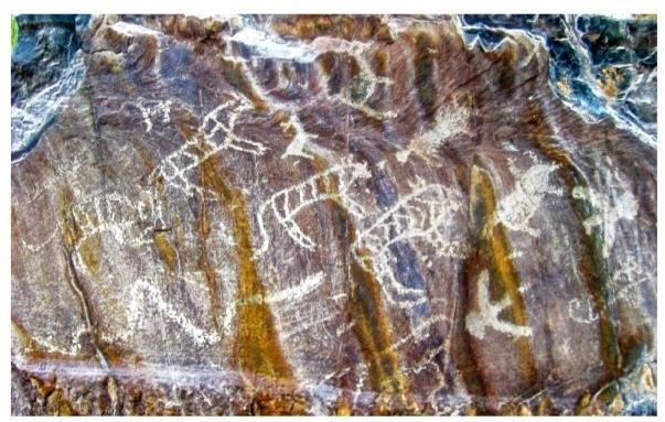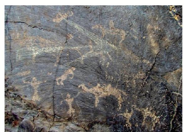 黑山巖畫全稱為“黑山摩崖淺石刻巖畫”,分布于嘉峪關西北約 10—20公里處的黑山峽谷陡崖峭壁上,為遠古時期黑山地區(qū)游牧民族生產、生活的真實記錄。現共發(fā)現分布在黑山石關峽口、磨子溝、蕉蒿溝、四道股形溝、紅柳溝、交河溝六處戰(zhàn)國至明代時期的巖畫,共 157 幅。黑山巖畫反映的時限跨度大,時空關系復雜,涉及部族較多。畫面所反映的內容豐富多彩,有動物、人物、佛塔、植物等,還有大型的操練舞蹈場景。涉及人類學、社會學、歷史學、考古學、美術學、生物學、地理學等多個學科,具有較高的研究價值。