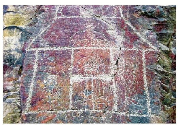 黑山巖畫中的晚期巖畫,主要反映宗教文化。紅柳溝、石關峽口巖畫中的殿堂、佛塔、佛像、古藏文題刻,可能屬于唐代中期以后的宗教遺物。藏傳佛教在 7世紀時同古藏文一起為吐蕃松贊干布創(chuàng)立。據史書記載,唐因平定“安史之亂”,河西空虛,吐蕃乘機占領河隴之地達 100 余年。吐蕃人居住河西,在紅柳溝、石關峽刻畫佛教殿堂、菩薩、佛像、佛塔是完全可能的。由此推斷,黑山紅柳溝、石關峽口佛塔、佛像及藏文題刻為唐中期以后的吐蕃所留。