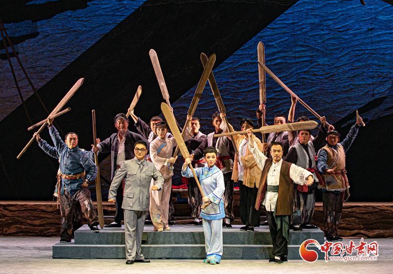 隴劇《大河東流》于19日晚在甘肅黃河劇院成功首演。該劇以20世紀30年代末抗戰(zhàn)為背景,運用具有地方特色的隴劇形式,生動地描繪了大西北黃河邊的一群筏客子在國家危難之際,如何放下個人恩怨,團結起來支援抗戰(zhàn),組成水上大型運輸隊,將大量物資安全送達抗戰(zhàn)前線,創(chuàng)造了“羊皮筏子賽軍艦”的傳奇故事。(甘肅省隴劇院供圖)
