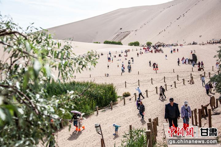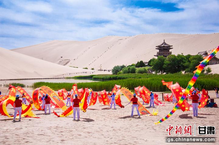6月10日,敦煌市鳴沙山下,一場(chǎng)以敦煌市舞龍隊(duì)為首的20個(gè)健身舞蹈隊(duì)為廣大市民和游客獻(xiàn)上一臺(tái)臺(tái)精彩的舞蹈盛宴,吸引了眾多游客圍觀、拍照,在敦煌大漠度過一個(gè)難忘的端午節(jié)。王斌銀 攝