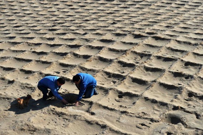 記者從敦煌研究院了解到,到2014年,經(jīng)過70年持續(xù)風(fēng)沙治理,風(fēng)沙對(duì)敦煌莫高窟的危害顯著降低,進(jìn)入窟區(qū)年積沙量減少85%以上。據(jù)敦煌研究院保護(hù)所副所長汪萬福介紹,在幾代治沙人的努力下,莫高窟頂已形成由防沙障阻沙、沙生植物林帶擋沙、麥草方格沙障固沙和礫石壓沙組成的風(fēng)沙防治綜合體系,極大減緩了風(fēng)沙對(duì)敦煌壁畫和塑像等文物的危害,改善了窟區(qū)生態(tài)環(huán)境。圖為2014年8月29日,兩名工作人員檢查用于固沙的麥草方格。新華社記者陳斌攝