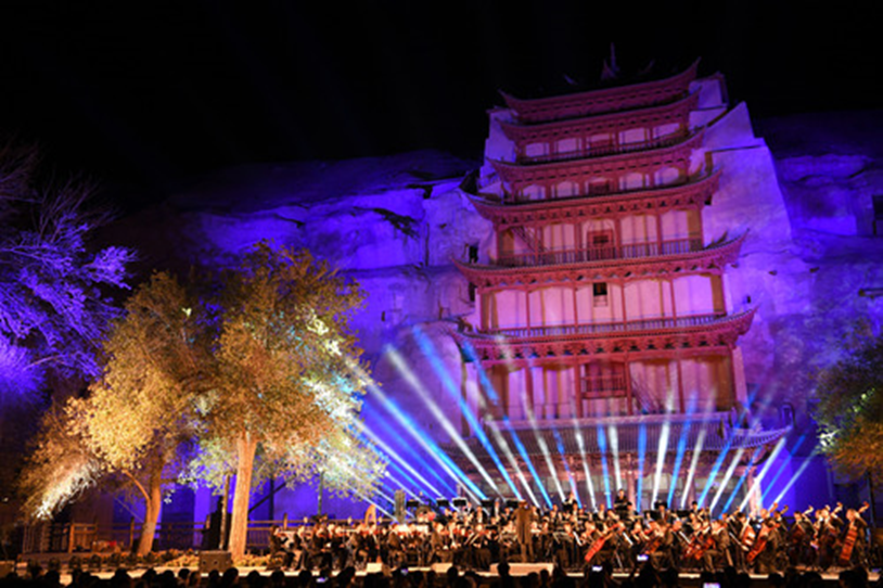 2016年9月15日,首屆絲綢之路(敦煌)國際文化博覽會(huì)系列活動(dòng)之一的敦煌莫高窟1650周年紀(jì)念音樂會(huì)在莫高窟舉行。著名指揮家陳燮陽、特邀音樂家趙聰?shù)人囆g(shù)家奉上了具有絲綢之路沿線諸國特色的經(jīng)典曲目,2000余名觀眾在莫高窟九層樓廣場前追憶絲綢之路的璀璨歷史,聆聽穿越古今的藝術(shù)交響。