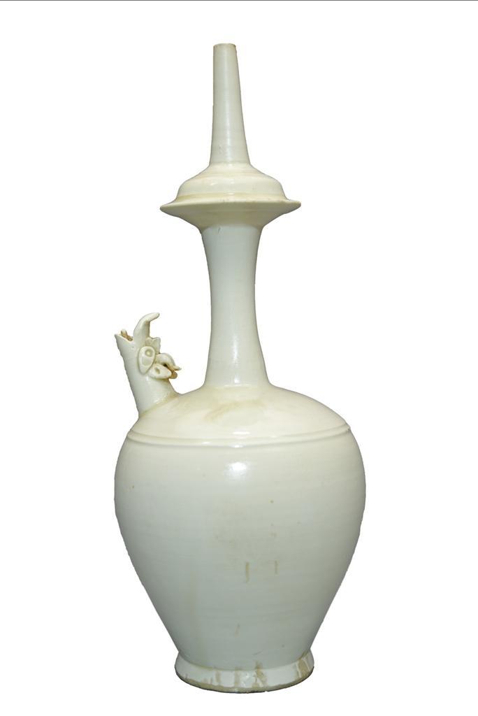 胎白質(zhì)細(xì)堅(jiān)致,釉白泛黃,底足無(wú)釉。采用堆塑技法,小口長(zhǎng)頸,頸中部飾一相輪狀圓盤,下頸束腰,圓肩鼓腹下收,圈足外撇。肩腹交接處飾弦紋三道,肩的一側(cè)塑龍首流。