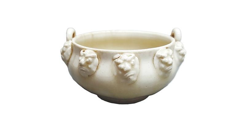 胎白質(zhì)細(xì),內(nèi)外垂?jié){淚痕處閃青,足底無(wú)釉,采用模印和堆貼技法。大口短頸,鼓腹內(nèi)收,口外附二個(gè)對(duì)稱的環(huán)形耳,耳根部飾三個(gè)鉚釘形圓餅,兩耳間各貼五個(gè)怒目圓睜的頭面像。