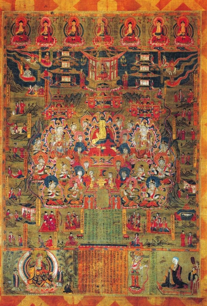 該畫為絹地設(shè)色,出自敦煌莫高窟藏經(jīng)洞。畫面中心為說法圖,一佛二菩薩法相莊嚴,諸菩薩、弟子、比丘、比丘尼、優(yōu)婆塞、優(yōu)婆夷等“赴會圣眾”圍繞周圍。兩側(cè)及上方分布15幅經(jīng)變故事圖,以連環(huán)畫形式鋪陳展現(xiàn)《佛說父母恩重經(jīng)》的基本內(nèi)容。其上繪七佛、彌勒與七寶,其下墨書《佛說報父母恩重經(jīng)變》。絹畫最下方自左向右排布地藏菩薩、《繪佛邈真紀》、引路菩薩及比丘尼戒行邈真像。該絹畫保存完整,色彩絢麗,是敦煌《佛說父母恩重經(jīng)》諸變相中,內(nèi)容最復(fù)雜,畫面情節(jié)最多,特點最鮮明,風格最獨特的一幅,且有宋淳化二年(公元991年)明確紀年,具有重要的歷史、藝術(shù)和研究價值。