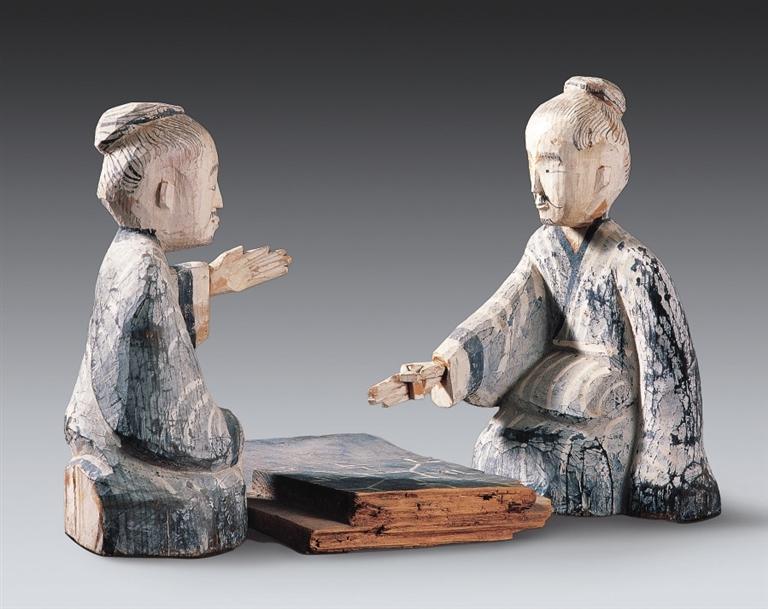 彩繪木六博俑,西漢,武威磨嘴子出土。木俑為兩位跪坐對局的老者形象,二者間設(shè)一長方形棋盤。老者神情凝滯,蓄勢待發(fā),顯然正在緊張的六博對局之中。考古發(fā)現(xiàn)中不乏漢代博局、棋子、骰子等六博器具,漢墓畫像磚中也常見相關(guān)圖像,但以雕塑刻畫六博對局卻極為罕見,這件文物充分體現(xiàn)了漢代木雕藝術(shù)所達到的高度與境界。