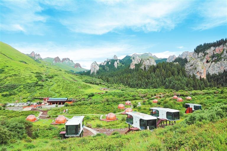 夏河縣的??撇菰?,游人在山間草場、樹林河邊支起一頂頂帳篷,白天品著飄香的奶茶,晚上躺在草地上仰望星空,很是愜意。
