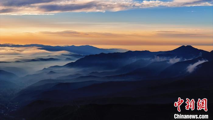 8月14日晚,蘭州市榆中縣馬坡鄉(xiāng),夕陽在云海里翻滾,映照大地和村莊城鎮(zhèn),美不勝收。圖為云海日落籠罩黛青色山脈。丁永睿 攝