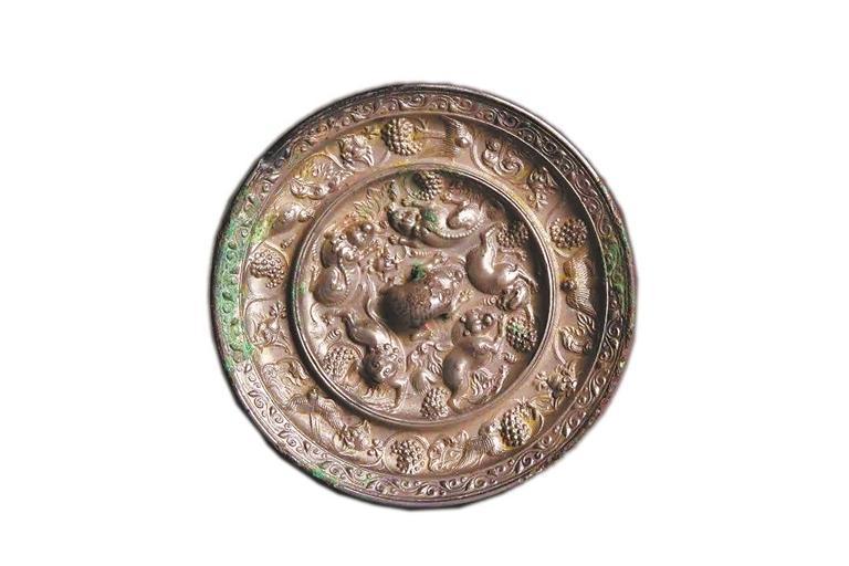 我省天水市博物館的眾多藏品中,有一面海獸葡萄紋銅鏡,大致出現(xiàn)于武則天執(zhí)政時(shí)期(684年—705年)。銅鏡上五只瑞獸作匍匐狀,攀援著葡萄枝蔓,這里的海獸就是來(lái)自西域的獅子,古人稱為“狻猊”。此外鏡上葡萄藤葉鋪陳、點(diǎn)綴著禽鳥(niǎo)和卷草,精美絕倫,彰顯著大唐開(kāi)放包容的盛世氣象。