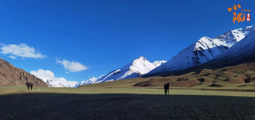 初秋,草香撲面而來,綠草漸被秋風(fēng)染黃,與雪山、藍(lán)天繪成一幅層次鮮明的風(fēng)景畫。