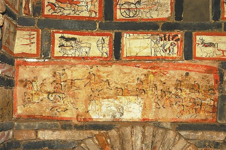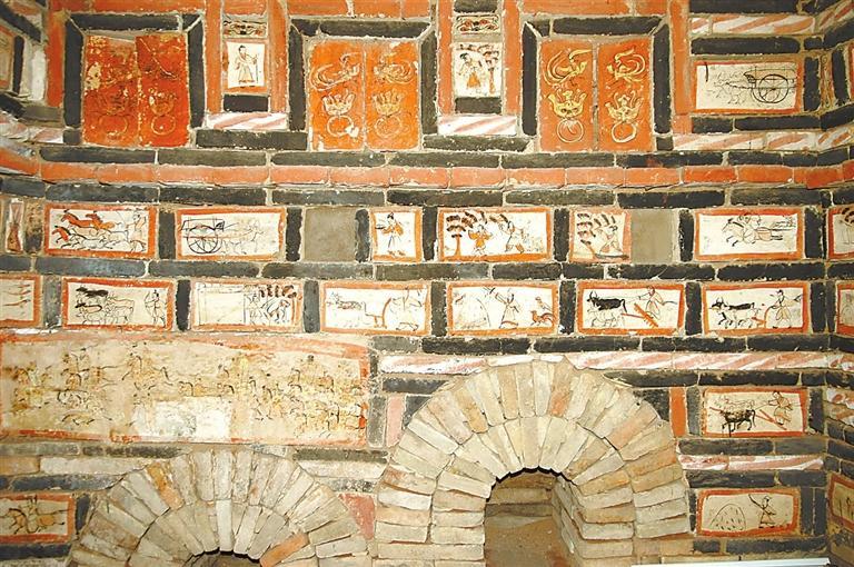 魏晉十六國磚畫在墓中的布局、組合,體現(xiàn)出 “滿”和“層”的特點。整個墓室,各方位、各邊角以及過道均鑲砌畫磚。以嘉峪關(guān)果園—新城5號墓畫磚的布局為例,各層間隔、同層緊鄰的畫磚,給觀者的感覺就是整幅壁畫,但每一塊又是一個獨立的畫面,這種“樣式”,是魏晉十六國時期的河西匠工、畫工,在繼承漢晉磚室墓的同時,將畫像磚在墓室布局的方式也加以接受。艷麗的色彩,“忠實”生活的寫實手法,又是河西畫匠們的創(chuàng)新和發(fā)揮。