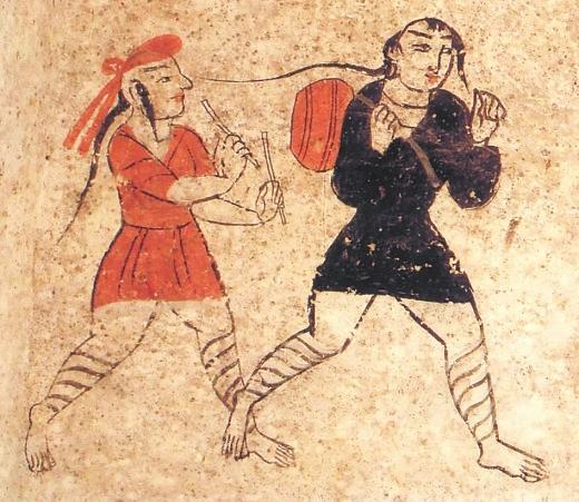 除此之外,河西彩繪壁畫磚圖像中,還有一些反映娛樂的圖像,主要有樂舞圖和六博圖。高臺地埂坡壁畫中的“角抵百戲”中,一著辮者在作表演,他小腿部網(wǎng)狀綁腿,蹲踞,雙手?jǐn)傞_,似乎是在表演魔術(shù),又似乎是在歡迎到場的人們。“擊鼓”中,兩人網(wǎng)狀繃腿,髡發(fā)梳辮,著黑裝者背鼓,著紅裝者持雙鼓槌準(zhǔn)備擊鼓。孫機先生謂,戰(zhàn)國迄漢盛行六博,博具和博戲的圖像在考古資料中不乏其例。甘肅以武威磨嘴子漢墓出土木六博俑為例。六博俑以簡單明確的藝術(shù)造型,刻畫了兩個老者全神貫注博弈的場面,惟妙惟肖地表現(xiàn)出對弈時蓄勢待發(fā)的場面。在高臺壁畫墓中的博戲場面略有不同,二博者戴船形帽,打手勢。從相貌看,很可能是少數(shù)民族。高臺出土彩繪壁畫磚上,兩人動作幅度更大,左邊一人的黃紅色著裝和博具上的零散物品,顯得場面更為熱烈激情。