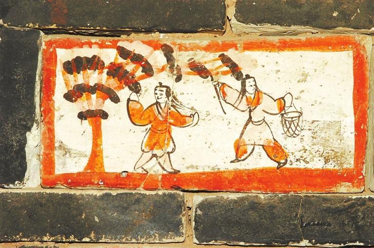 畫師創(chuàng)作時,首先在磚坯表面涂一層白色粉層,然后再勾勒畫面。白粉層多為白堊,偶爾也有用石膏等礦物,彩繪顏料以礦物質(zhì)為主,如石綠、朱砂、赭石等,原料膠結(jié)物為植物膠、動物膠及白礬。有專家指出,嘉峪關(guān)果園—新城魏晉畫磚上的黃色顏料,來自于嘉峪關(guān)附近。礦物質(zhì)顏料的特性,使得艷麗色彩不易脫落,因此彩繪壁畫磚畫即使經(jīng)歷千年歲月磨礪,仍鮮艷如新,奔放熱烈。這些壁畫磚展現(xiàn)了河西魏晉居民粗獷豪邁,不拘一格的精神風(fēng)貌。