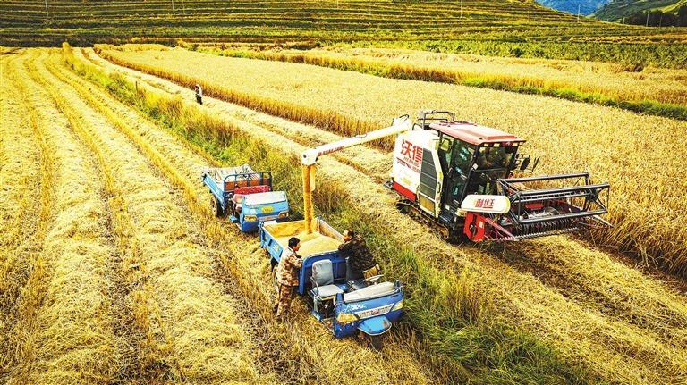 天??h朵什鎮(zhèn)萬畝梯田,農(nóng)機(jī)手駕駛收割機(jī)收割小麥。新甘肅·甘肅日報通訊員 趙世鵬