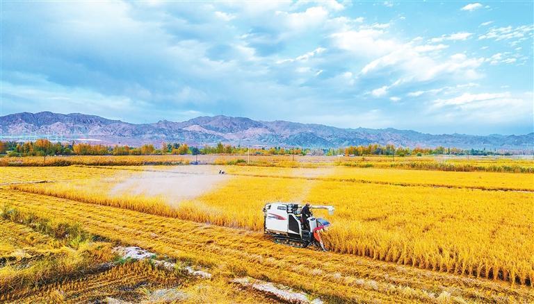 張掖市甘州區(qū)烏江鎮(zhèn)大灣村2000多畝稻田一片金黃,村民正在進(jìn)行搶收作業(yè)。新甘肅·甘肅日報通訊員 楊瀟