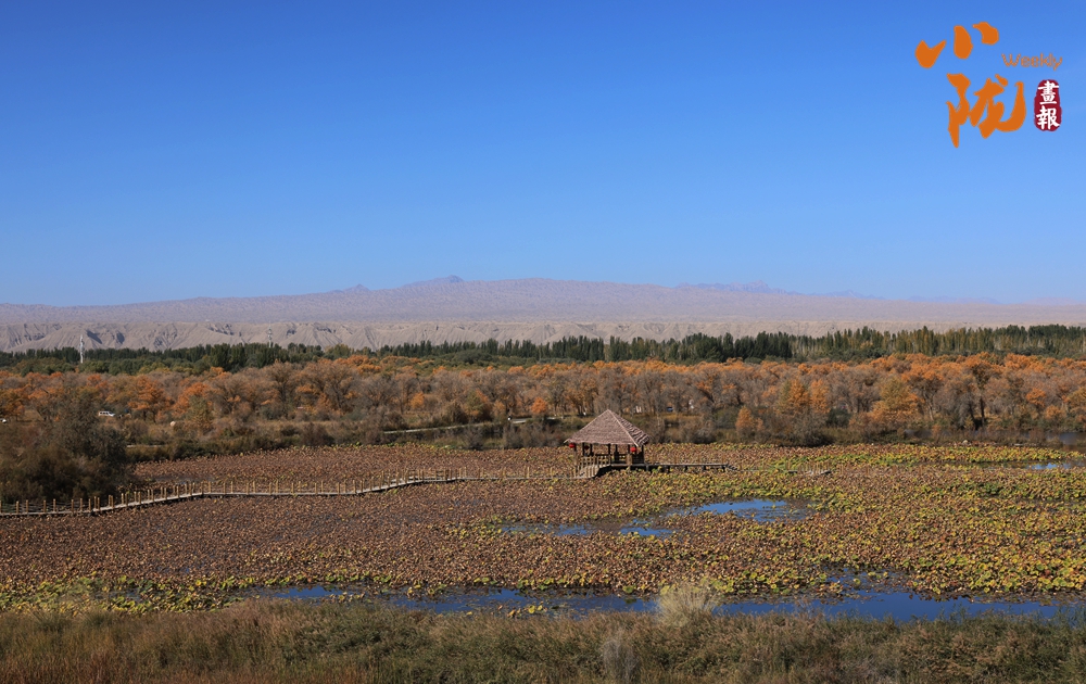 一大片荷花池,因為是深秋,池內(nèi)的荷葉已經(jīng)枯萎,變成金黃色,與周邊的金胡楊相映成趣。蒼勁的胡楊,高雅的荷花在此結(jié)緣。葦草繁茂,野花盛開,置身其中,仿佛走進金色的海洋。