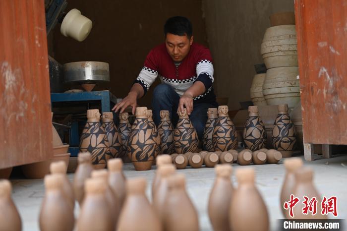4月11日,甘肅省天水市秦安縣康坡村陶藝車間內(nèi),甘肅省級(jí)非物質(zhì)文化遺產(chǎn)名錄秦安陶器燒制技藝天水市級(jí)傳承人康曉龍趕制大地灣文創(chuàng)彩陶。李亞龍 攝