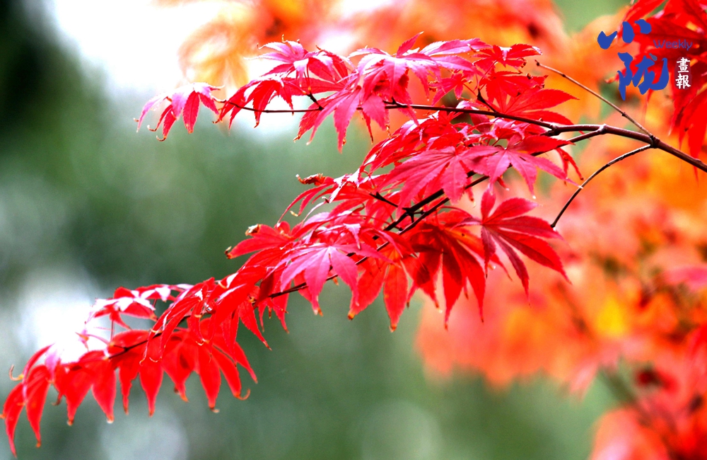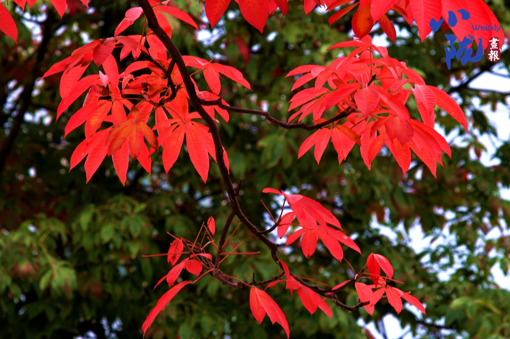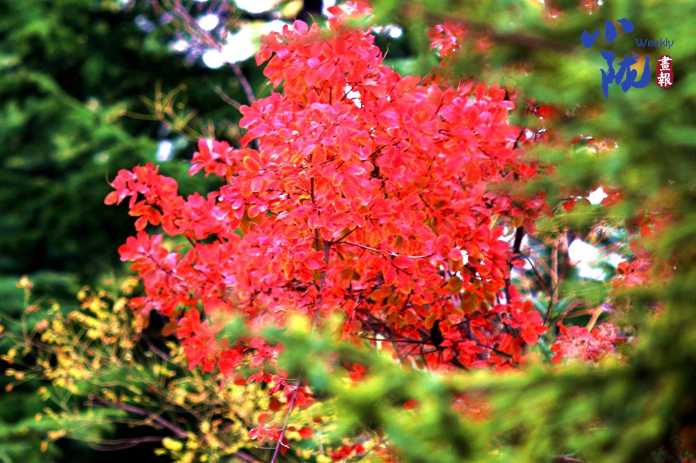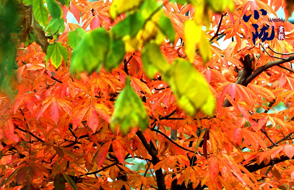 淡淡的秋霜將樹葉染成綺麗多彩的鮮紅和金黃,與綠葉共舞,層層疊疊,在凋零中展現(xiàn)生命的堅韌。