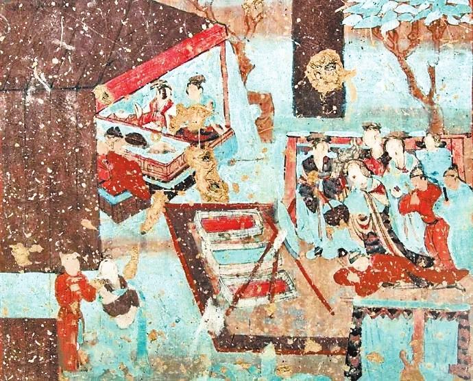 古人會(huì)在一年的歲末舉行一次集體聚會(huì),稱作“建福”。在敦煌文獻(xiàn)《社司轉(zhuǎn)帖》中寫道:“右緣常年建福一日,人各爐餅壹雙,凈粟壹斗。幸請(qǐng)諸公等,帖至限今月廿二日卯時(shí)于安家酒店取齊。”意思是說(shuō),只要有可能,每年到了年末大家都要選擇一日來(lái)進(jìn)行建福。每家每戶需要按時(shí)把準(zhǔn)備建福的物資送過(guò)來(lái)。唐朝詩(shī)人李白在《客中行》一詩(shī)中寫道:“蘭陵美酒郁金香,玉碗盛來(lái)琥珀光。但使主人能醉客,不知何處是他鄉(xiāng)。”意思是說(shuō)蘭陵美酒甘醇甜美,就像郁金香一樣芬芳四溢。興來(lái)盛滿玉碗,泛出琥珀光晶瑩迷人。主人端出如此好酒,定能醉倒他鄉(xiāng)之客。飲酒之后哪能分清故鄉(xiāng)與他鄉(xiāng)呢?歲暮聚飲蘊(yùn)含有辭舊迎新、攘兇納吉的美好愿望。在莫高窟第12窟壁畫中有一幅“帳篷酒肆圖”:畫面中圍坐在條形長(zhǎng)桌兩邊正盡興暢飲的客人為七人,還有兩個(gè)熱情忙碌的服務(wù)人員。整個(gè)畫面是一幅酒酣耳熱、興致高昂的歡飲圖。更為氣勢(shì)恢宏、熱鬧非凡的是莫高窟第23窟壁畫中一幅“院落圖”:畫面中分院落之內(nèi)與院落之外兩個(gè)部分,院落之內(nèi)是世俗的世界,畫面上布局著鱗次櫛比的廳堂房屋,有人正在庖廚、有人正在對(duì)弈、有人正在暢聊、有人正在團(tuán)聚,也有人正在說(shuō)教,總之表現(xiàn)的是我們?nèi)粘I畹陌賾B(tài)。院落之外是佛國(guó)世界,整體呈現(xiàn)出肅穆莊嚴(yán)之感。有趣的是在佛國(guó)與世俗世界中間,畫的是服飾艷麗,騎馬遠(yuǎn)行的人們。