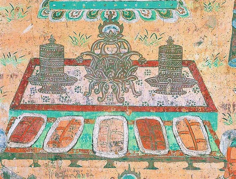 宋朝詩(shī)人陸游在《食粥》一詩(shī)中寫道:“世人個(gè)個(gè)學(xué)長(zhǎng)年,不悟長(zhǎng)年在目前。我得宛丘平易法,只將食粥致神仙。”意思是說(shuō)人人都期盼長(zhǎng)壽,怎么也沒(méi)有想到,我就成了長(zhǎng)壽之人。如果讓我總結(jié)一下我長(zhǎng)壽的秘訣,那就是我喝的粥多而已。想想冬天到了,天寒地凍,喝碗粥,渾身上下暖烘烘的多美啊??墒窃诙鼗捅诋嬂?,人們?cè)诙静皇呛戎?,而是喝熱牛奶。在莫高窟?46窟壁畫中有一幅“擠牛奶圖”:畫面上一頭健碩的母牛正在被人擠奶,它回首望向擠奶者。在它的身下,還有一只小牛犢正貪婪地望著擠奶者。兩頭牛都憨態(tài)可掬、萌蠢可愛(ài)。漫天飛雪中,煮沸的牛奶溫暖著漫長(zhǎng)冬季的每時(shí)每刻。在莫高窟第302窟中有一幅“湯水浴圖”。湯水就是溫泉。畫面上在樹木掩映之下有一池溫泉,有一大一小兩個(gè)人正沉浸在溫泉沐浴的歡快之中??梢?jiàn),伴著紛飛的大雪泡個(gè)溫泉,不是只有今天才有的享受;在千年之前的敦煌,人們就已經(jīng)開始修建溫室浴池,而且引水排水的技術(shù)已經(jīng)較為完善。院落依依、親朋融融、池水湯湯、筋骨軟軟,逸興悠悠。